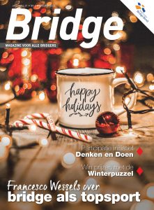 In het magazine van januari een bijzonder interview met prestatiemanager bij NOC*NSF Francesco Wessels, die de denksporten in zijn pakket heeft. Gaat Chris Niemeijer dieper in op de ‘ Vierde kleur forcing’. Maak je kennis met Monique Visscher, vormgeefster bij de BridgeBond. Lees je een rapportage over twee bridgeclubs die samen een zijn geworden en wordt het ‘bal geopend’