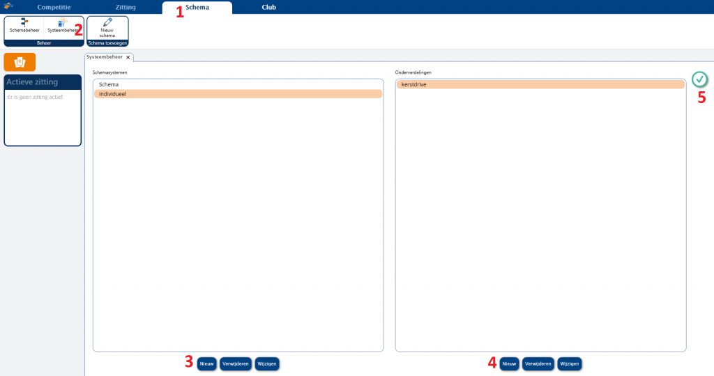 De bestandsnaam van een schema is als volgt opgebouwd: het eerste getal is het aantal deelnemers, het laatste getal is het aantal ronden. Bar staat voor Barometer, How voor Howell, Mitc voor Mitchell en Indi voor individueel. Maak binnen het NBB-Rekenprogramma 4 eerst eenmalig de categorie individueel aan. Ga naar het menu Schema (1)-> Systeembeheer (2). Klik hier onder schemasystemen op ‘nieuw’ (3). Kies een systeemnaam, bijv. ‘Individueel’ of ‘Beker’. Klik nu aan de rechterkant bij onderverdelingen op ‘nieuw’ (4). Geef een naam op voor de onderverdeling. In het onderstaande voorbeeld is gekozen voor ‘kerstdrive’, maar dit kan ook een jaartal zijn of de naam van het toernooi. Sluit het scherm met het groene vinkje (5).