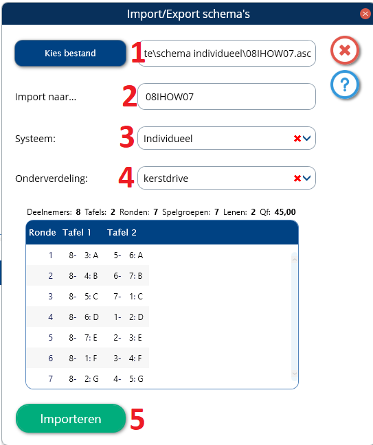 Kies bij ‘Systeem’ (3) en ‘Onderverdeling’ (4) het net aangemaakte schemasysteem en onderverdeling. Nadat je op ‘Importeren’ (5) hebt geklikt staat je schema in het NBB-Rekenprogramma en kun je meteen een volgend schema importeren of het scherm sluiten.