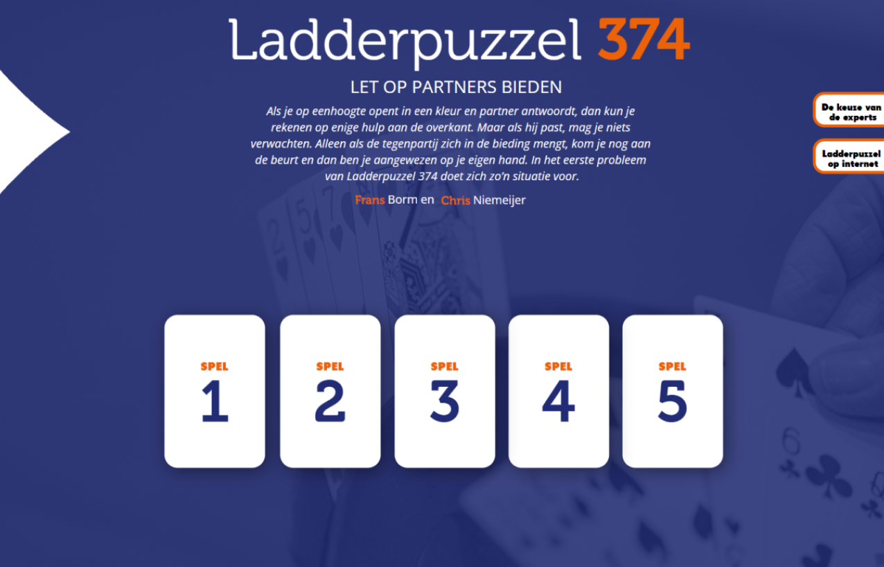 In de E-zine van BridgeNL worden de oplossingen van experts en andere inzenders vergeleken in een panel en besproken door Chris Niemeijer en Frans Borm. Behalve dat de ladderopgaven gewoon leuk zijn om te doen kun je er dus wat van leren en zelfs winnen.