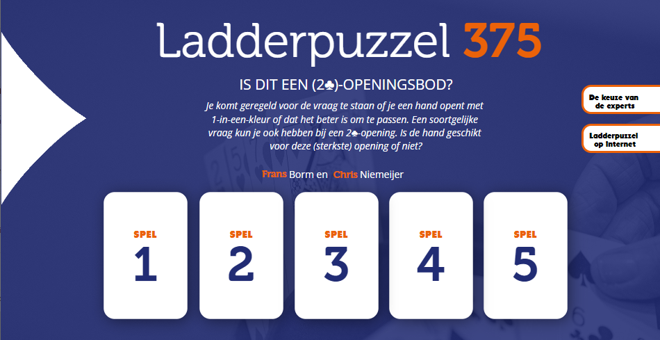 In de E-zine van BridgeNL worden de oplossingen van experts en andere inzenders vergeleken in een panel en besproken door Chris Niemeijer en Frans Borm. Behalve dat de ladderopgaven gewoon leuk zijn om te doen kun je er dus wat van leren en zelfs winnen.