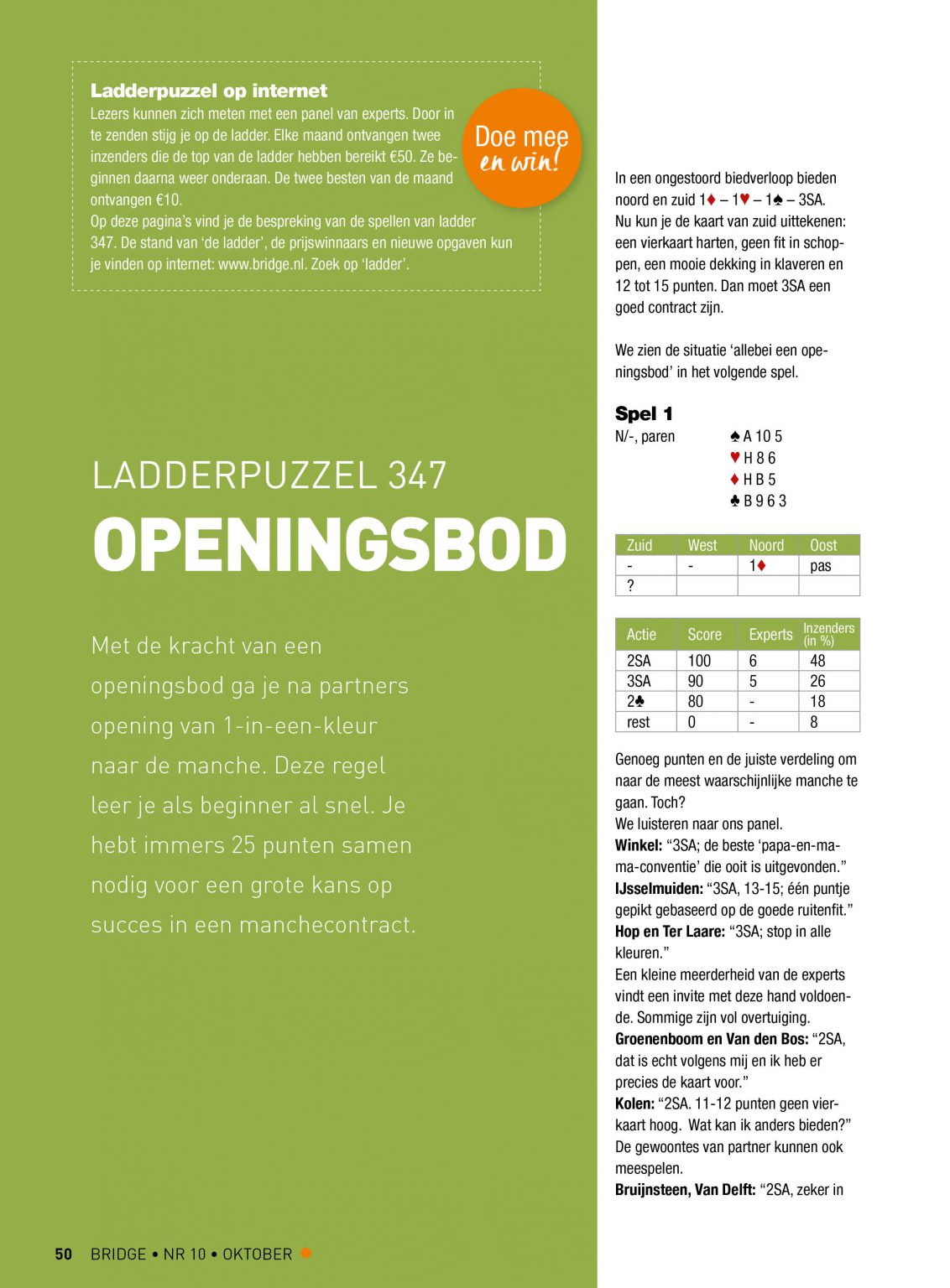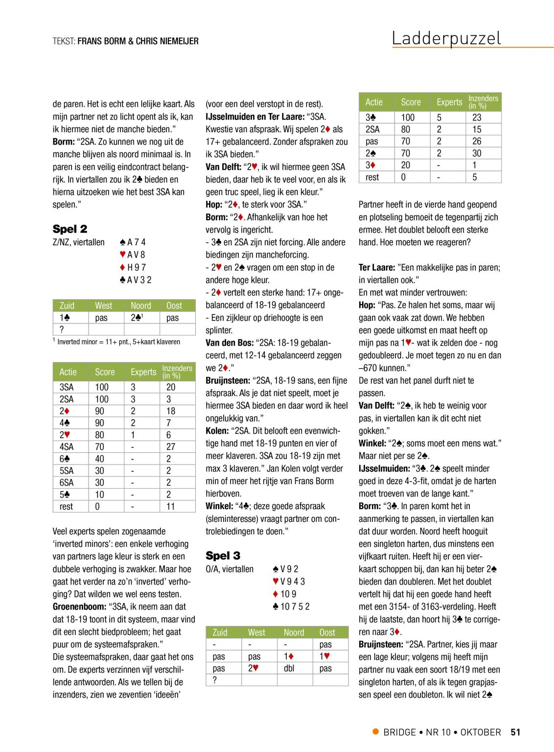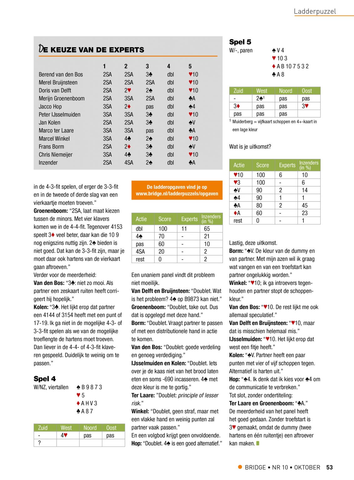 In het blad Bridge en op de website worden de oplossingen van experts en andere inzenders vergeleken in een panel en besproken door Chris Niemeijer en Frans Borm. Behalve dat de ladderopgaven gewoon leuk zijn om te doen kun je er dus wat van leren en zelfs winnen.