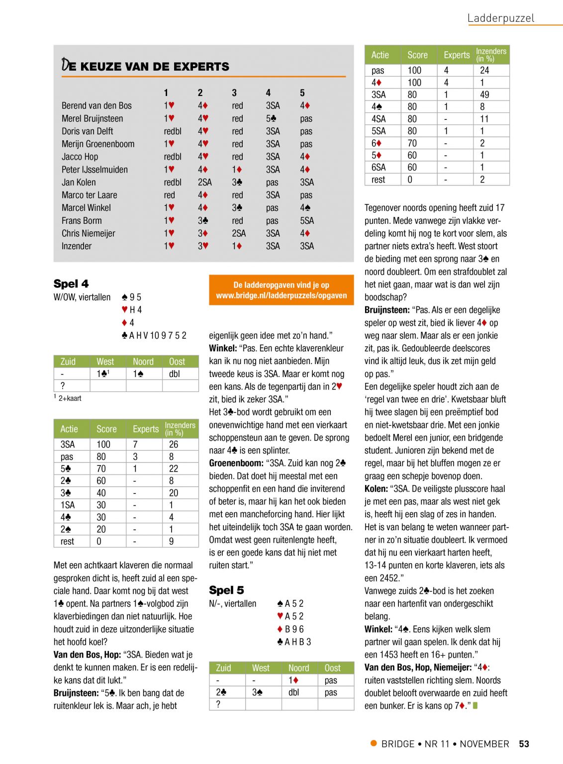 In het blad Bridge en op de website worden de oplossingen van experts en andere inzenders vergeleken in een panel en besproken door Chris Niemeijer en Frans Borm. Behalve dat de ladderopgaven gewoon leuk zijn om te doen kun je er dus wat van leren en zelfs winnen.