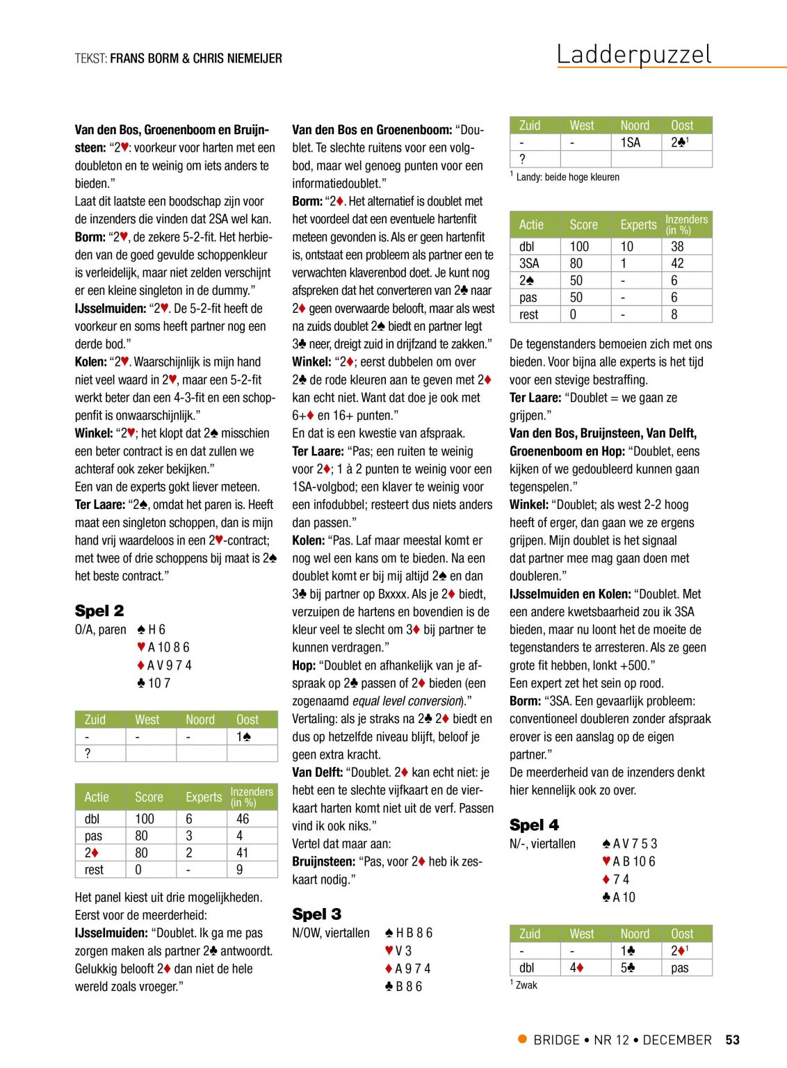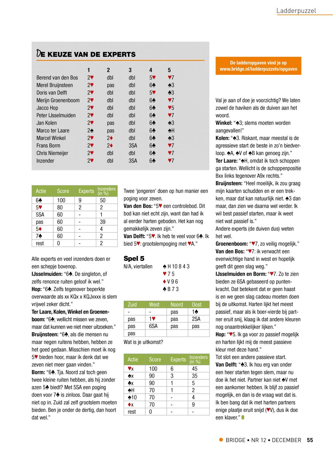 In het blad Bridge en op de website worden de oplossingen van experts en andere inzenders vergeleken in een panel en besproken door Chris Niemeijer en Frans Borm. Behalve dat de ladderopgaven gewoon leuk zijn om te doen kun je er dus wat van leren en zelfs winnen.