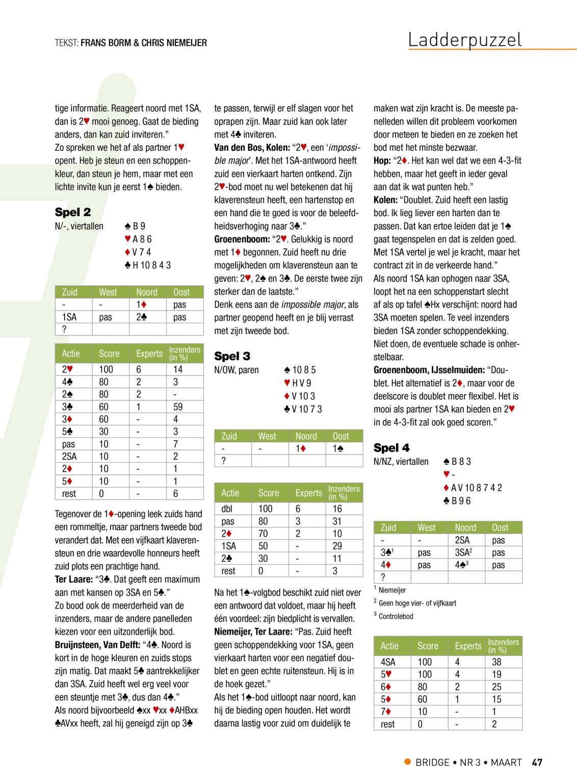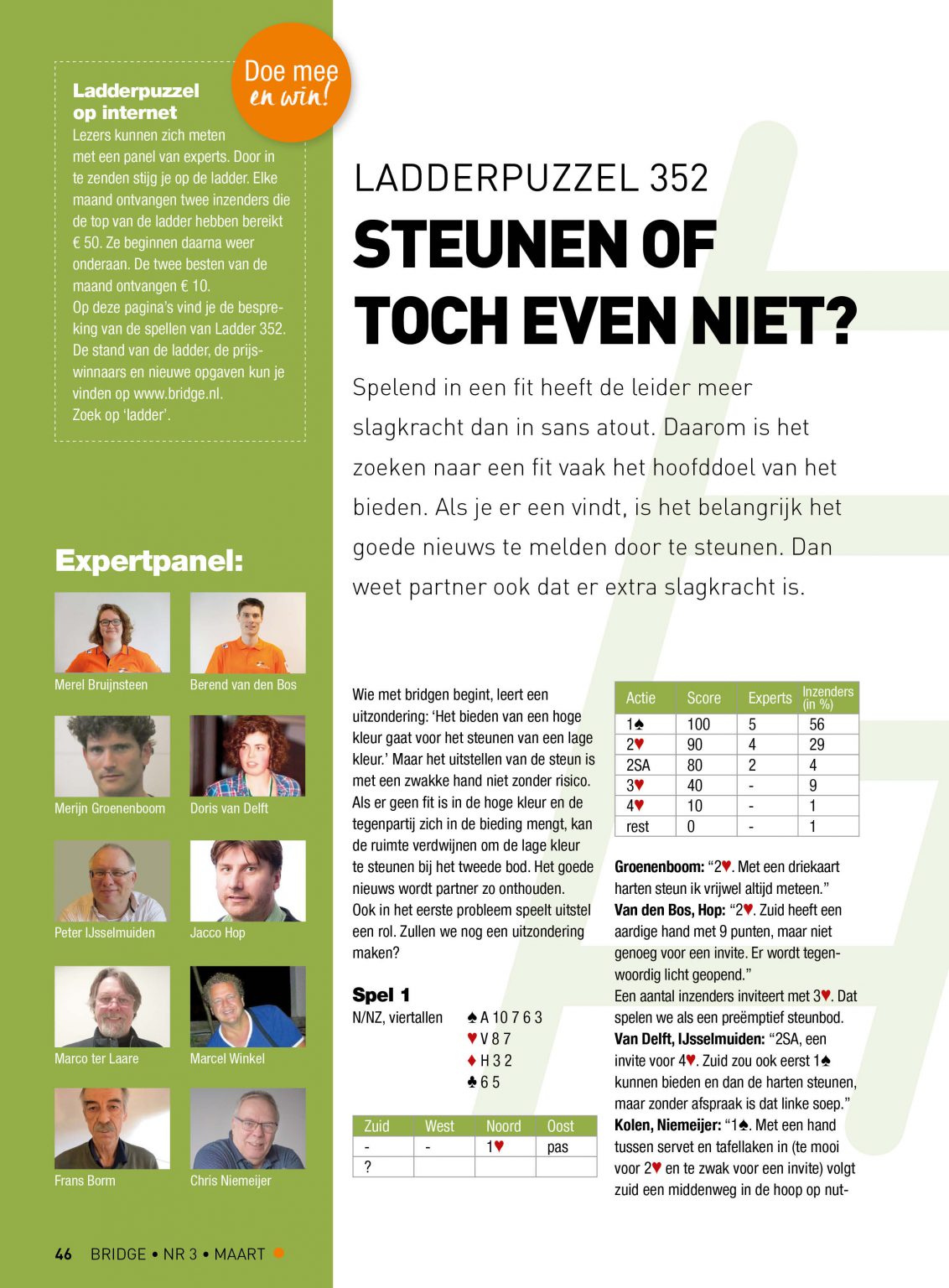 In het blad Bridge en op de website worden de oplossingen van experts en andere inzenders vergeleken in een panel en besproken door Chris Niemeijer en Frans Borm. Behalve dat de ladderopgaven gewoon leuk zijn om te doen kun je er dus wat van leren en zelfs winnen.