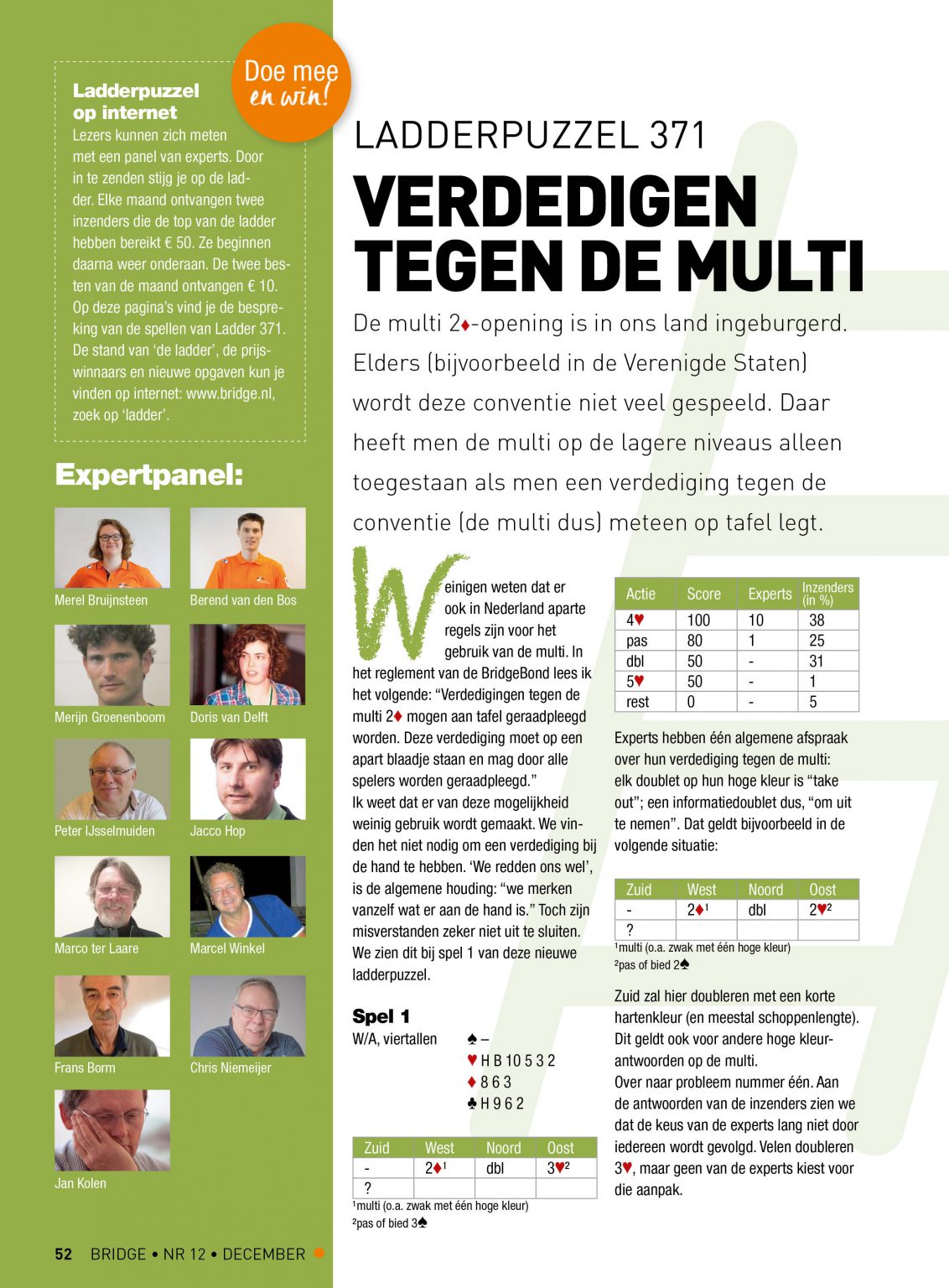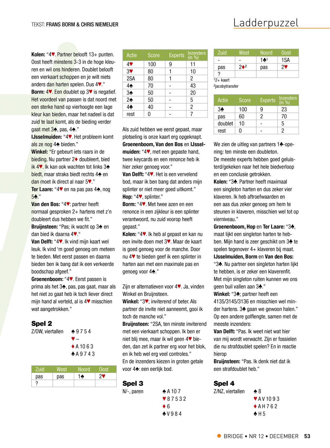 In het blad Bridge en op de website worden de oplossingen van experts en andere inzenders vergeleken in een panel en besproken door Chris Niemeijer en Frans Borm. Behalve dat de ladderopgaven gewoon leuk zijn om te doen kun je er dus wat van leren en zelfs winnen.