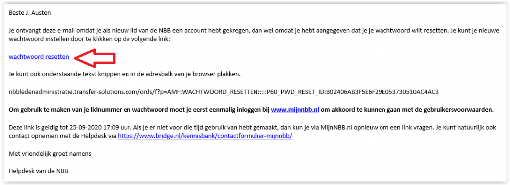 Open je e-mailprogramma. Er is een mail naar je verstuurd. Soms staat deze in de map voor ongewenste e-mail (spam). In die mail staat een link waar je op moet klikken: ‘wachtwoord resetten’.