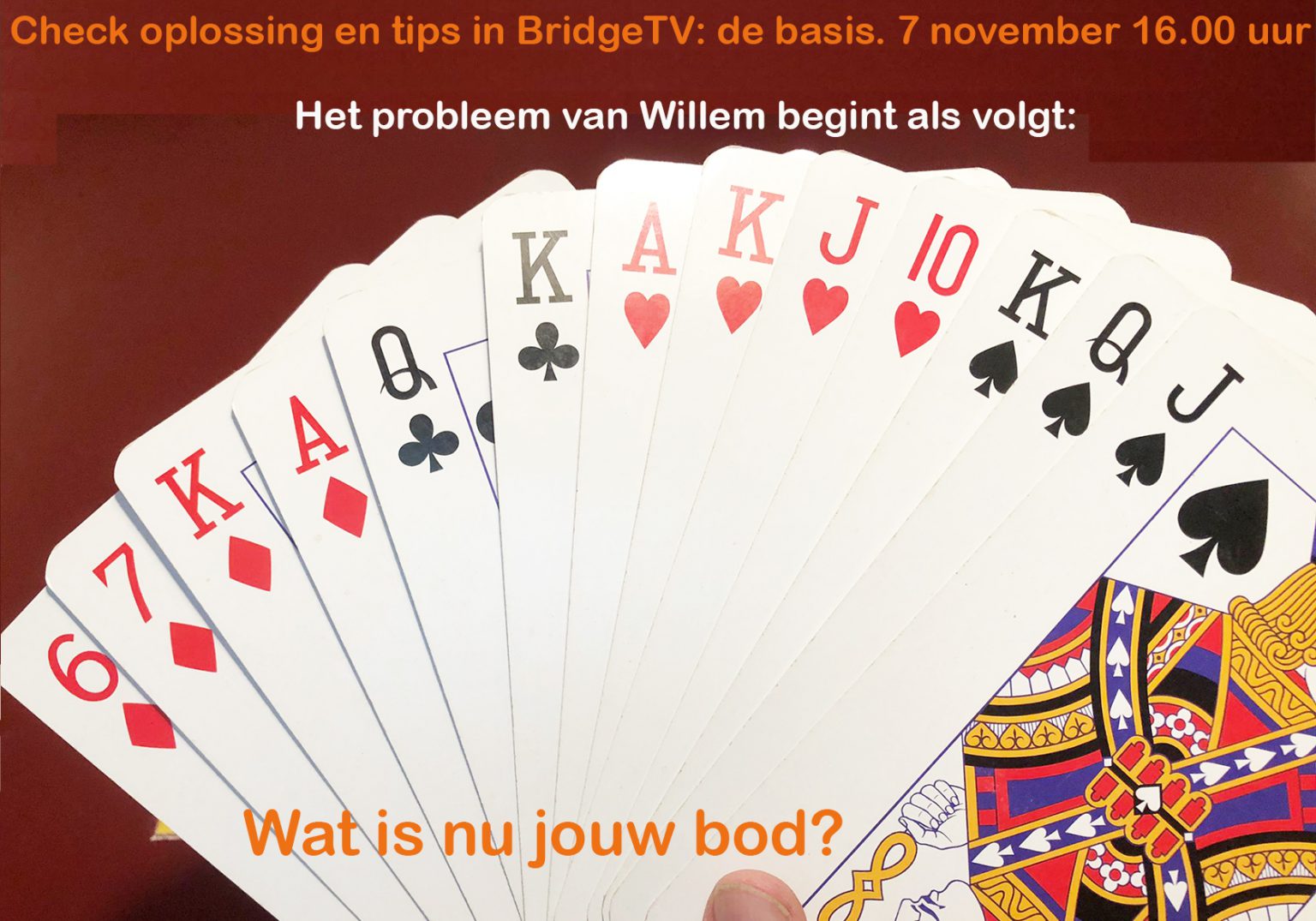 In de uitzending van 7 november behandelen we het probleemspel van Willem (zie de foto onder). Deze loeisterke hand verdient een beetje vooruitdenken… Hoe bied je deze zesentwintigpunter aan bij je partner? Je kunt hier kijken en meechatten via facebook of de uitzending volgen hier op de kijkpagina. Eerdere uitzendingen kun je zien op de terugkijkpagina. Host Geon ontvangt kijkersinzendingen. Dit seizoen belonen we niet de oplossing, maar het probleem. Stuur ook jouw spel in naar coach en panel via debasis@bridge.nl. Haalt jouw spel de uitzending, dan levert je dat een prijs op uit de Bridge- en Boekenshop.