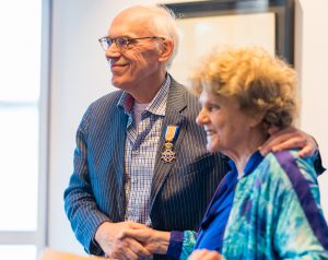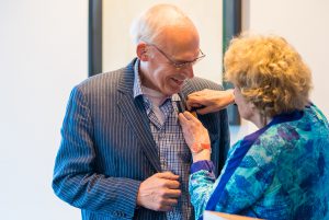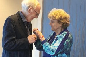 Bep Vriend, Antons vrouw en zelf al een aantal jaren gedecoreerd, verricht de plechtigheden die de burgemeester i.v.m. corona niet zelf kan doen.