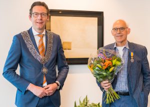 Bep Vriend, Antons vrouw en zelf al een aantal jaren gedecoreerd, verricht de plechtigheden die de burgemeester i.v.m. corona niet zelf kan doen.