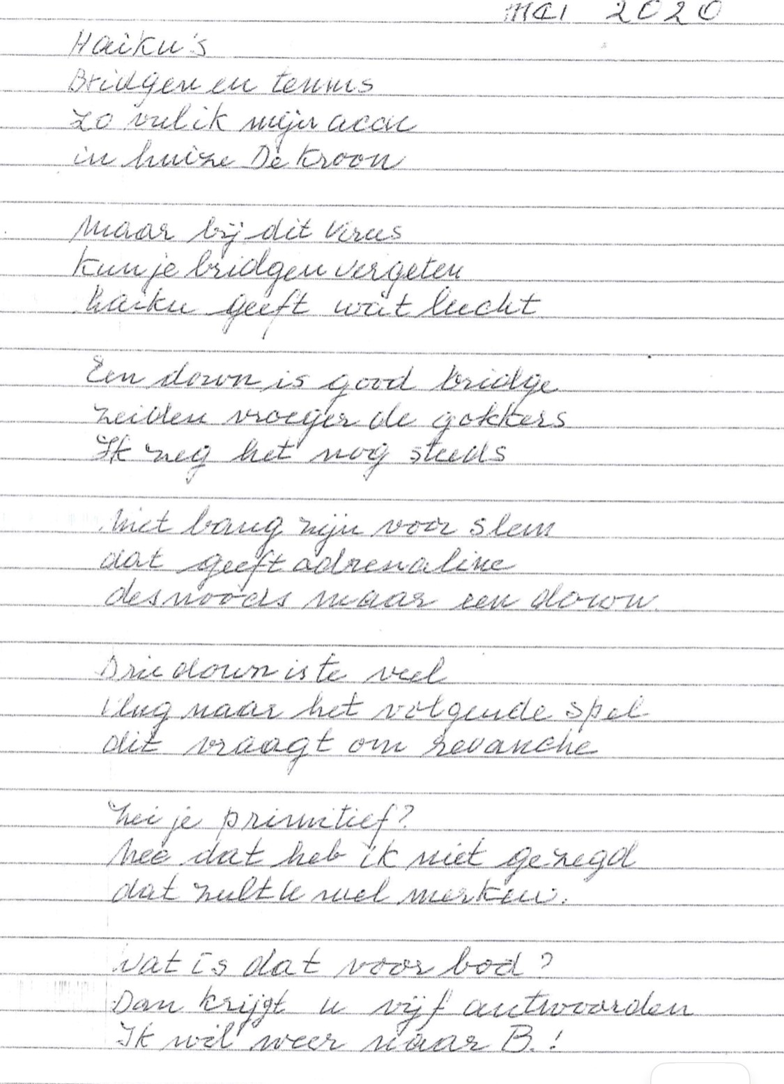 Ron Oortwijn zendt als creatieve tip in om haiku’s te componeren. Inmiddels is het uitgegroeid tot een hype op de BridgeBond Facebookpagina.