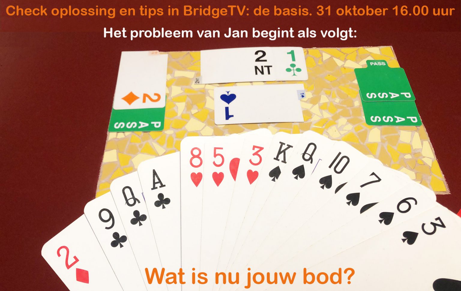 Op maandag 31 oktober om 16.00 uur hebben we het probleemspel van Jan behandeld (zie het filmpje voor de oplossing, doe eerst de warming up in de foto onder). Je kunt nog steeds meechatten via facebook of de uitzending volgen hier op de kijkpagina. Eerdere uitzendingen kun je zien op de terugkijkpagina. Host Geon ontvangt kijkersinzendingen. Dit seizoen belonen we niet de oplossing, maar het probleem. Stuur ook jouw spel in naar coach en panel via debasis@bridge.nl. Haalt jouw spel de uitzending, dan levert je dat een prijs op uit de Bridge- en Boekenshop.