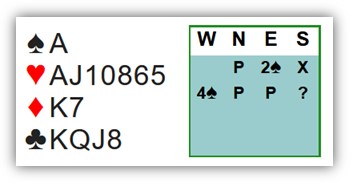 Het bod van 2 schoppen door de tegenpartij was Muiderberg. Je eerste doublet is gemakkelijk, maar nu komt er 4 schoppen voorbij. Je hebt opties… doublet, 5 harten of iets anders?