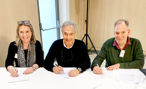 Voorzitter Jan Kamras (midden) ondertekent het contract namens de EBL. Naast hem doen bondsvoorzitter Johan Pieters (rechts) en bondsbureaudirecteur Berit van Dobbenburgh (links) dat voor de BridgeBond. De ondertekening vond plaats op Cyprus, tijdens het NBO Officers’ Seminar in Larnaca.