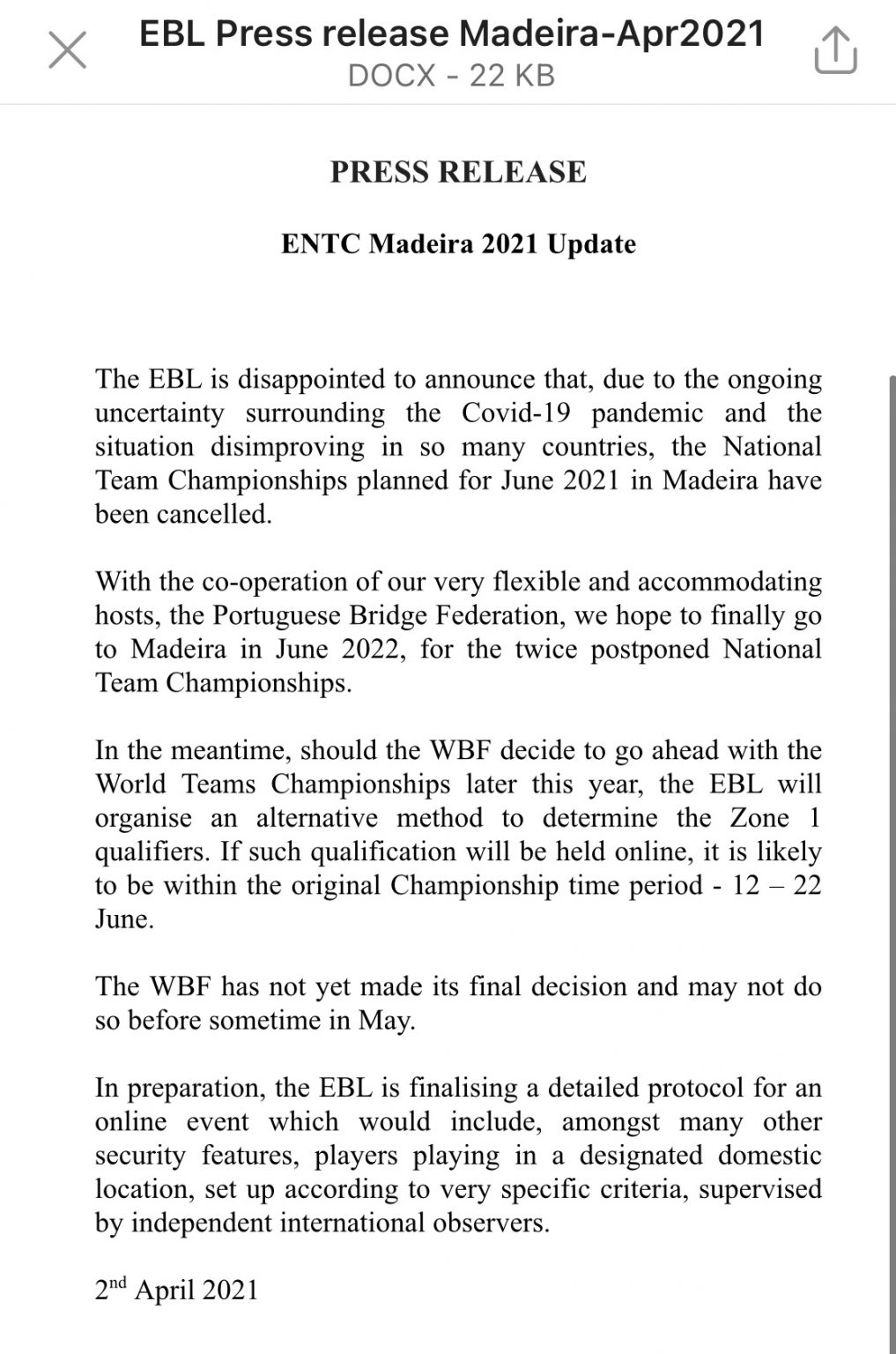Het in juni geplande Europese kampioenschap voor landenteams in Madeira gaat ook dit jaar niet door. Dit heeft de EBL inmiddels besloten, vanwege de onzekerheid rondom de Covid-19 pandemie.