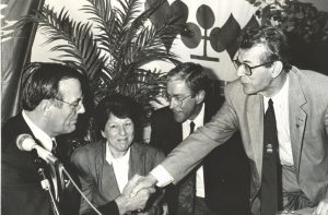 Henk van Aarst (links) als penningmeester van de Nederlandse Bridge Bond. vlnr: Henk van Aarst, Emmy van Strien-Spiekman, Folkert Schukken, Wim Wagner