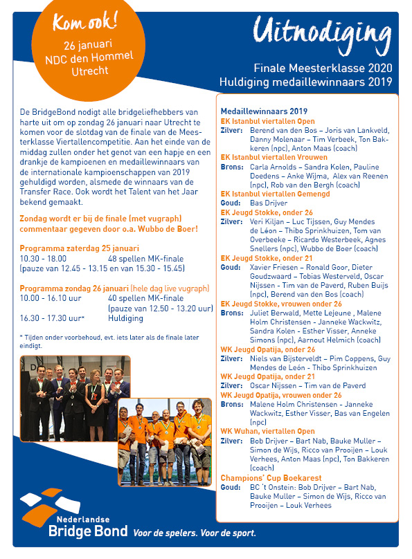 Zondag 26 januari was een zeer feestelijke dag. Naast de landskampioenen huldigden we de kampioenen en medaillewinnaars van de internationale kampioenschappen van 2019 en de winnaars van de Transfer Race. De huldiging startte rond 16.30 uur. Om de feestvreugde verder te verhogen bood de BridgeBond daarbij een hapje en een drankje aan.
