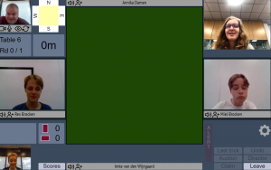 Op de foto: Rex-Miel en Annika-Imke zitten aan de teamtafel klaar voor de vierde wedstrijd. Linksboven is co-captain Erik van Egmond te zien.