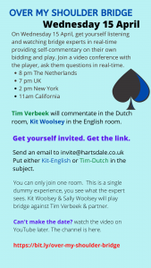 Woensdag 15 april kun je Tim Verbeek volgen. Je kunt weer kiezen voor de Nederlandstalige kamer. De uitzending is op 15 april om 20.00 uur (Nederlandse tijd). Het niveau van het commentaar is voor gevorderden. Iedereen ziet net als de speler zelf maar een hand, het is een heel leuke manier om het spel mee te beleven. Zeker nu Tim Verbeek speelt tegen  Kit Woolsey. Ditmaal is er een Nederlandse en Engelstalige kamer. Wil je live meekijken en vragen stellen?  Zorg dat je een invitatielink krijgt via invite@hartsdale.co.uk. Klik op de poster voor een vergroting met alle info.