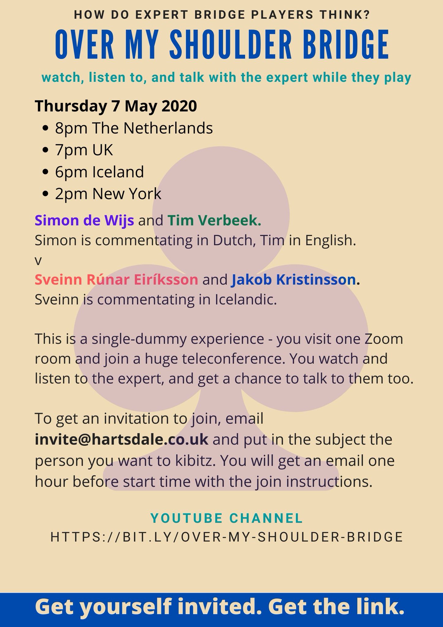 Donderdag 7 mei kun je Simon de Wijs (in het Nederlands) en Tim Verbeek (Engels) volgen. Je kunt weer kiezen voor de Nederlandstalige kamer, of misschien vind je nu ook de Engelstalige interessant. De uitzending is op 7 mei om 20.00 uur (Nederlandse tijd). Het niveau van het commentaar is voor gevorderden. Iedereen ziet net als de speler zelf maar een hand, het is een heel leuke manier om het spel mee te beleven. Wil je live meekijken en vragen stellen?  Zorg dat je een invitatielink krijgt via invite@hartsdale.co.uk. Klik op de poster voor een vergroting met alle info.