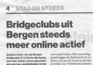 Bridgeclubs uit Bergen op Zoom zijn steeds meer online actief. Dat meldt BN De Stem. Bridgedocent Hans Verbiest geeft een cursus, waarbij ge­bruik wordt gemaakt van Zoom en StepBridge. Een mooie manier om je le­den te behouden en te blijven prik­kelen.