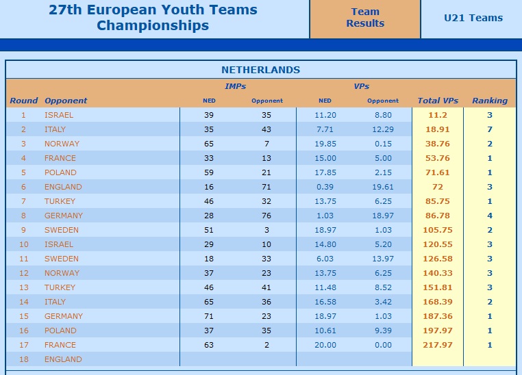 Voor de laatste wedstrijd staan zij meer dan 20 Victory Points voor en kunnen dus theoretisch niet meer ingehaald worden in één wedstrijd. Dat betekent nog een ererondje tegen Engeland, terwijl de nummers twee, drie, vier vechten om zilver. En dan zijn onze U21 kanjers EUROPEES KAMPIOEN VIERTALLEN.
