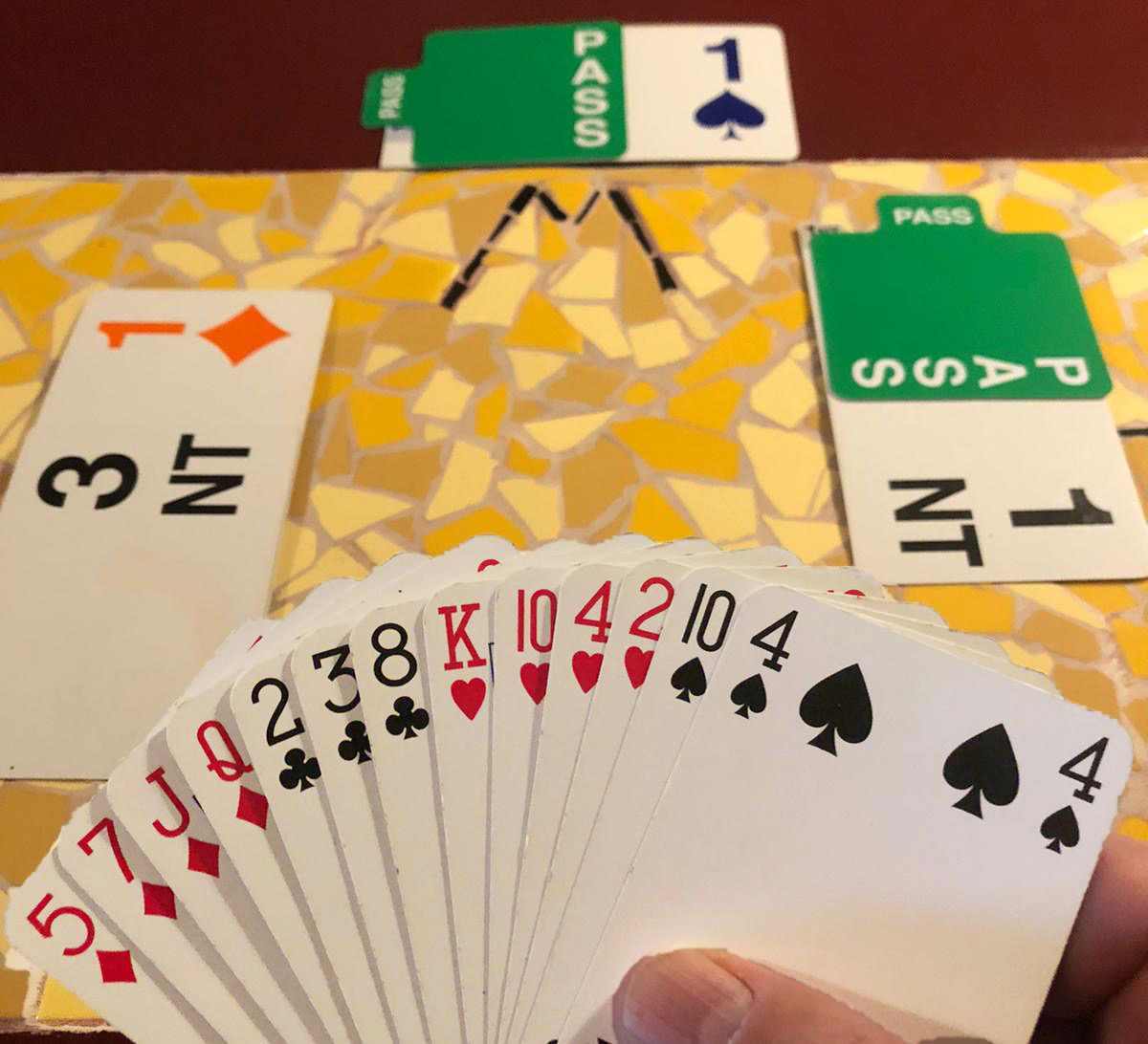 De tegenstander links van je heeft 1 ruiten geopend. Partner volgt 1 schoppen en rechts komt 1 sans. De tegenstander links biedt nu 3 sans en dat wordt het eindcontract. Het moment is daar, jij mag nu de eerste kaart op tafel leggen.