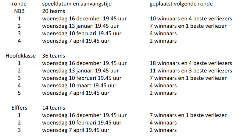 De bekerwedstrijden worden in drie categorieën (op drie niveaus) gespeeld: NBB, Hoofdklasse en Elffers. De bekerwedstrijden worden gespeeld volgens een afvalsysteem, bij winst ga je een ronde verder. Alle informatie over het toernooi vind je in de kennisbank. Wij wensen alle deelnemers een prettige en sportieve wedstrijd!