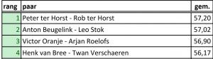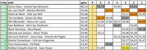 Tim Verbeek – Simon de Wijs hebben uiteindelijk een score van 60,95%. Wil Alkemade – Marco ter Laare zijn op plaats 2 geëindigd met een score van 59,20%. Mark de Meer en Rob van Wel zijn derde met 57,14%. Dank aan alle spelers voor een mooie wedstrijd en aan de vele toeschouwers voor jullie support!