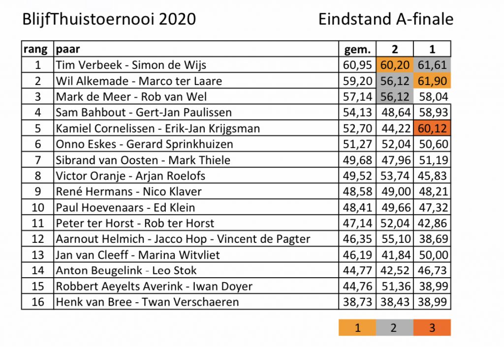 Ze zijn gespeeld: alle voorronden zitten erop. We maken zo snel mogelijk de totaalstand op. Dan weten we wie op maandag 1 juni de A-Finale van de BlijfThuistoernooi mogen spelen voor de eindoverwinning. Tim Verbeek en Simon de Wijs winnen met 63,54% de laatste voorronde (groep MK/Eerste Divisie). Tweede zijn Gerard Sprinkhuizen en Onno Eskes, derde Bert Paping en Rinus Spit. Eerste in de andere groep (rechten Tweede Divisie) zijn Mart Mommers en Ine Snepvangers met een score van 62,56%.