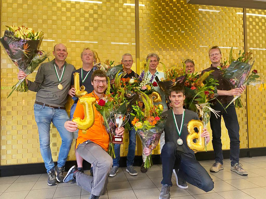 De Europese kampioenen zijn terug in Nederland, waar zij in een gouden decor met bloemen en egards zijn onthaald door Johan Pieters en Richard Meijer namens het bondsbestuur. Een mooie gelegenheid om de kampioenen nogmaals te feliciteren. Van links naar rechts op de foto (met dank aan Agnes Snellers!):