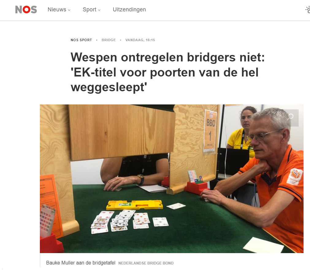 - Kleine kanttekening bij het artikel “Wespen ontregelen bridgers niet: ‘EK-titel voor poorten van de hel weggesleept’. De instanties (en zo ook de BridgeBond eerder) meldden geen wespen maar bijen of insecten in de zaal. Dat doet niet veel af aan de strekking van het bericht. Ook wespen blijven bijzaak.