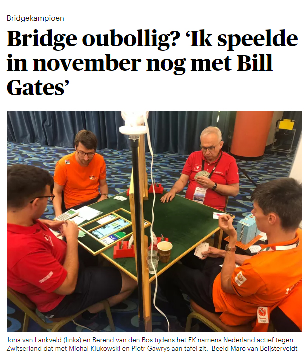- Het artikel dat in Trouw verscheen ‘Bridge oubollig? ‘Ik speelde in november nog met Bill Gates’ is door Nu.nl doorgeplaatst onder de titel ‘Bridge heeft eigenlijk een 20-jarige influencer nodig’