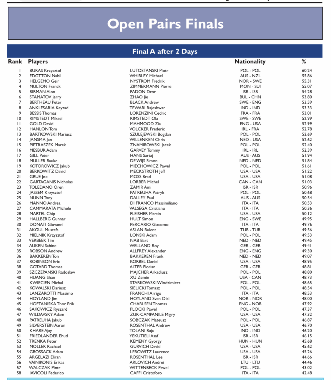 De open paren spelen de tweede dag van de finale. Daarin nog volop Nederlandse deelname met Jan Jansma (met Chris Willenken), Bauke Muller en Simon de Wijs, Ton en Frank Bakkeren, Tim Verbeek en Bart Nab. Deze sets beginnen om 10.00, 14.00, 15.30 en 17.20 uur.