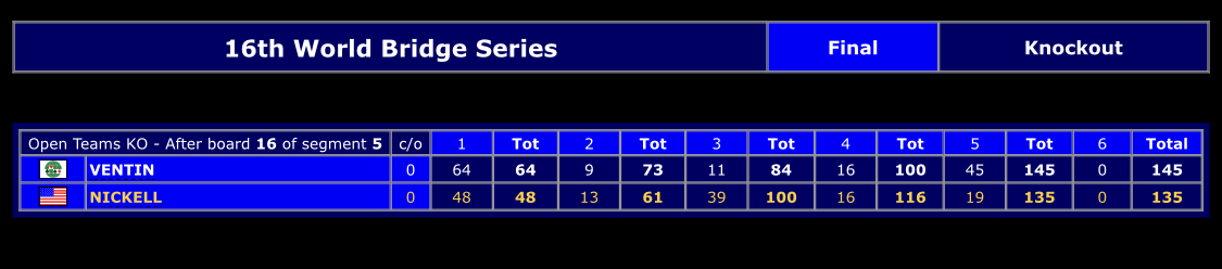 BBO zendt doorlopend wedstrijden uit van de World Series, hopelijk zien we deze teams vaak terug. Naar de vugraph van Bridgebase Online.