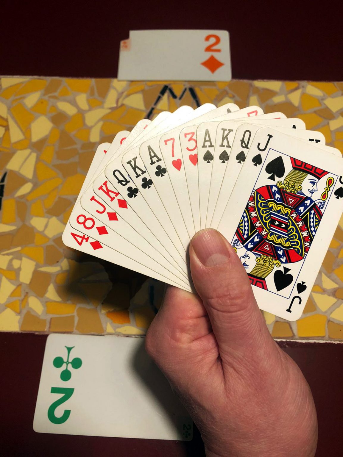 Je hebt een sterke hand en je opent daarom met 2 klaveren. De tegenstander links past. Je partner biedt 2 ruiten. De tegenstander rechts past ook. Nu ben jij weer met je 23 punten.