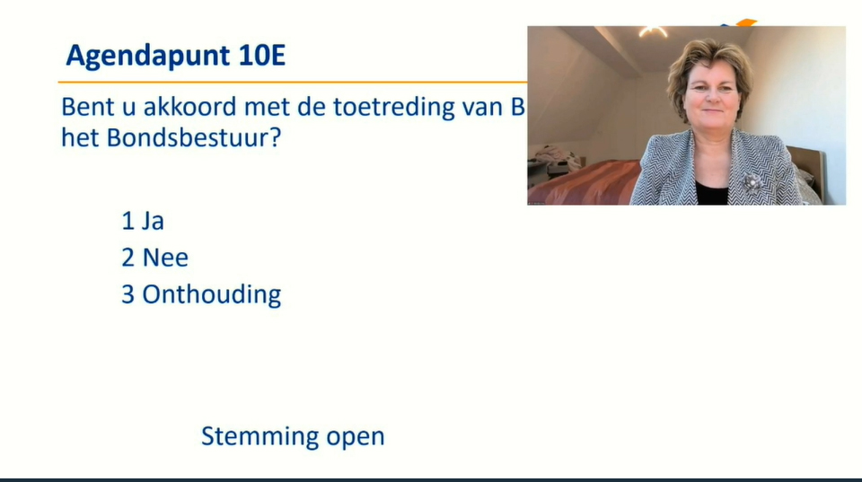 De presentaties door het bestuur en de commissies, de vragen via de chat die in de vergadering kwamen, de benoemingen en het digitaal stemmen, het verliep allemaal soepel en plezierig. Met veel plezier verwelkomen we Bibi de Vries in het bondsbestuur. Dank voor jullie aanwezigheid en uitgesproken vertrouwen!