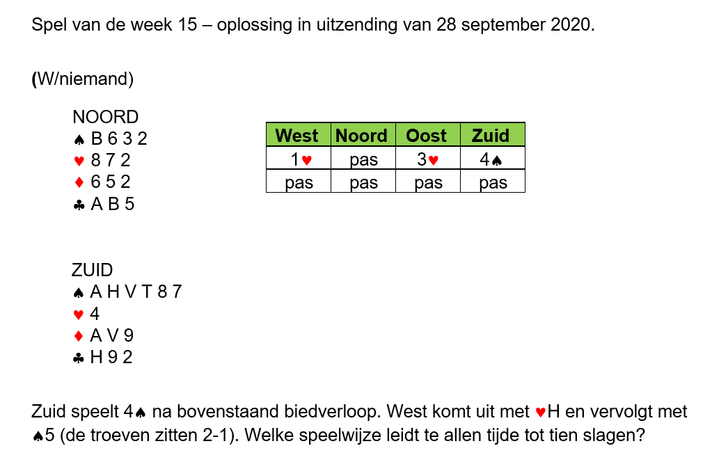 Maandag 28 september is er weer BridgeTV: gevorderd, waarin het ‘Spel van de week’ wordt besproken. Doe ook mee en stuur je oplossing in naar ondersteuning@bridge.nl
