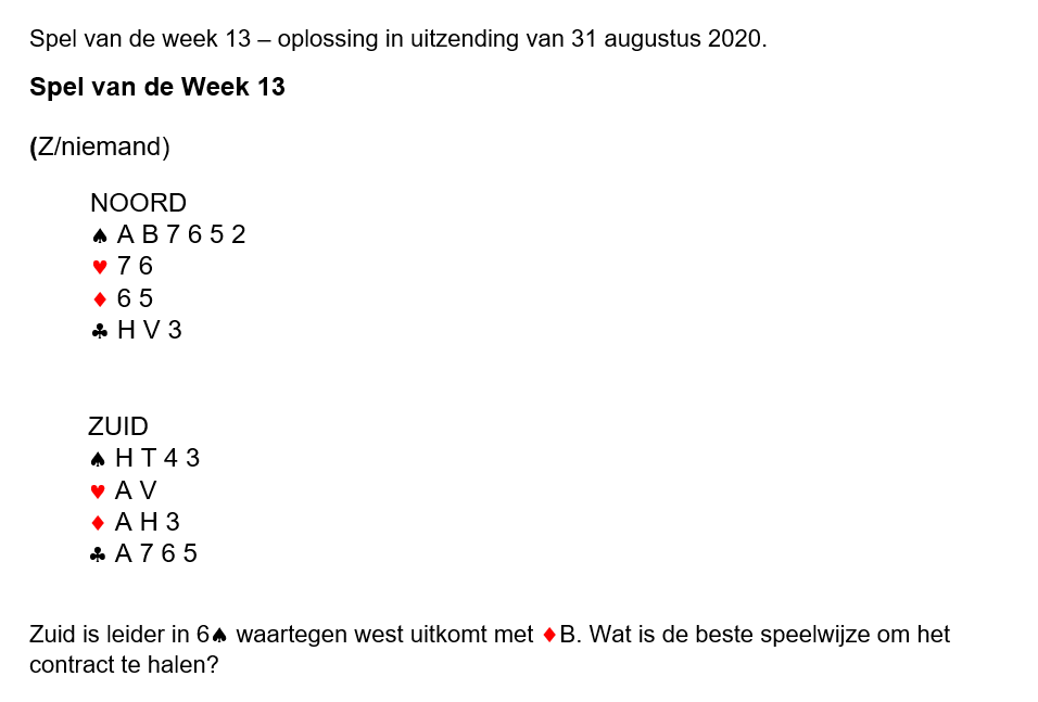 Maandag 31 augustus is er weer BridgeTV: gevorderd, waarin het ‘Spel van de week’ wordt besproken. Doe ook mee en stuur je oplossing in naar ondersteuning@bridge.nl