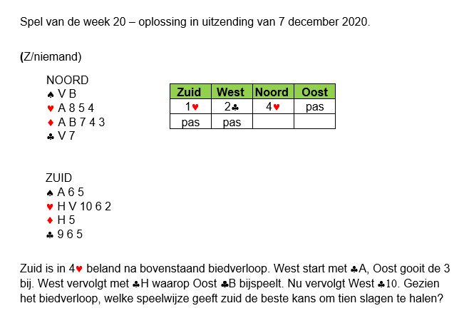 Maandag 7 december is er weer BridgeTV: gevorderd, waarin TeamNL Bridge Open spelers Simon de Wijs en Tim Verbeek het ‘Spel van de week’ bespreken. Doe ook mee en stuur je oplossing in naar ondersteuning@bridge.nl
