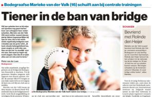 Op 16 november verschijnt in AD Groene Hart het bericht over Marieke die op haar zestiende in de ban is van bridge. Lees het volledige artikel hier. Of ga naar het online artikel (lees door onder de afbeeldingen).