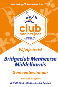 Maar liefst twee bridgeclubs mogen zich Club van het Jaar noemen. B.C. Menheerse uit Middelharnis en Bridge 82 uit Dongen. De BridgeBond feliciteert deze clubs met deze mooie prestatie!