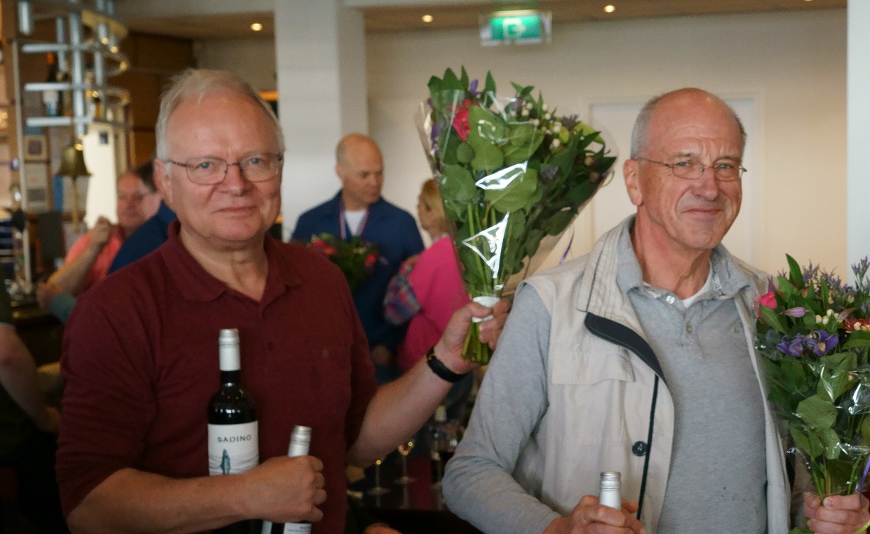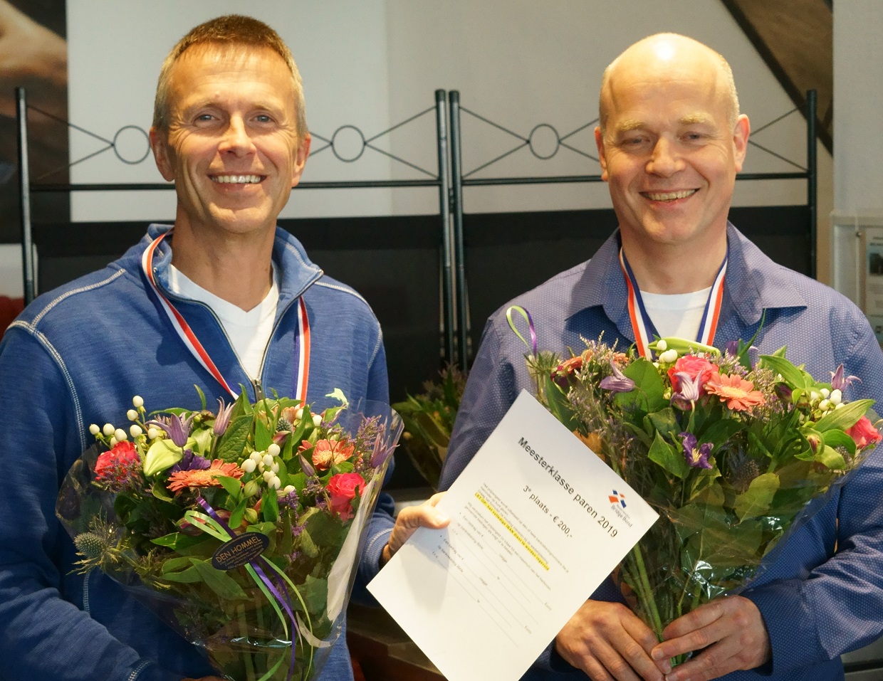 Op de bovenste foto reikt Theo van Munnen (vice-voorzitter van de BridgeBond) de eerste prijs uit aan de landskampioenen.