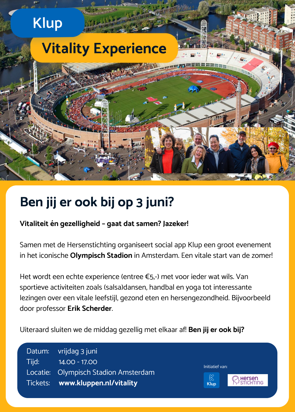 Bridge is gezellig, uitdagend en houdt je mentaal fit. Dat is ook vaak de reden waarom mensen starten met bridge. Deelnemen aan de Klub Vitality Experience past daarom helemaal bij ons. Het evenement georganiseerd door de Hersenstichting en Klub is gericht op 50plussers die gezond en fit ouder willen worden. Tijdens dit unieke evenement in het Olympisch Stadion in Amsterdam, kunnen bezoekers kennismaken met activiteiten die belangrijk zijn om fit te blijven. Zo is er een lezing van Erik Scherder en geeft een team van de BridgeBond een korte kennismakingsclinic Kwik Bridge.