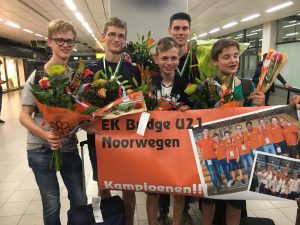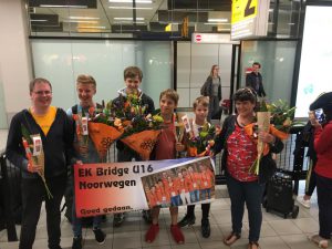 Met spandoeken en bloemen worden onze helden ingehaald na het EK Viertallen in Stokke. Goud, zilver en brons brengen zij mee en dat moeten we natuurlijk vieren!
