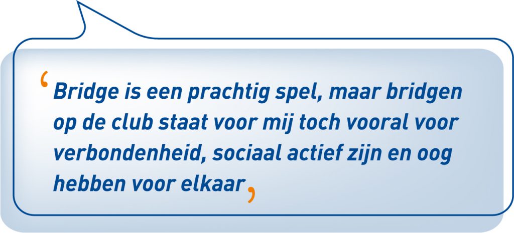 De speelavonden op de club zijn voor haar altijd al het meest bijzonder geweest. Ze kan zich niet herinneren ook maar één avond te hebben gehad dat ze het niet naar haar zin had of dat ze geen plezier had. ‘Ik maak natuurlijk ook wel eens een foutje en dan is er ook wel eens wat ergernis, maar ik vind het altijd heerlijk. Echt een fijne avond. Bridgen op een club is veel meer dan alleen maar een spelletje spelen. Het is een prachtig spel en natuurlijk zit er competitie achter, maar het staat voor mij vooral voor verbondenheid, sociaal actief zijn en oog hebben voor elkaar.’
