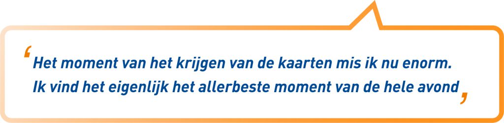 Het bridgen op de club mist Ilona ‘vreselijk’. Het was voor haar echt een uitje geworden. Goed verzorgd de deur uit gaan hoorde daarbij. Evenals een praatje maken bij binnenkomst. Een beetje spannend wordt het doorgaans voor Ilona als zij het tafelnummer krijgt toegewezen. Het wordt dan langzaam duidelijk aan welke tafel ze moet beginnen en tegen wie ze moet. Echt spannend wordt het voor haar wanneer zij het eerste spel kaarten in haar handen krijgt. Dat moment vergelijkt ze met het moment van de start van een handbalwedstrijd van vroeger. ‘Dan ging ik op de wisselbank zitten en dan kreeg ik een warm gevoel van de adrenaline en endorfine. Bij het bridgen denk ik: wat zal er gebeuren? Wat kan ik maken? Dat moment geeft een enorm gelukkig gevoel. Ik mis dat nu enorm. Ik vind het eigenlijk het allerbeste moment van de hele avond.’