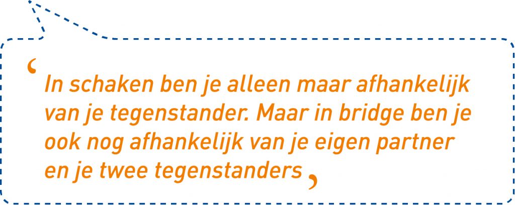 Iedereen moet van Ilona weten dat het ook een beetje om de gezelligheid gaat. Ze noemt het ook een gezelligheidssport. Met de nadruk op sport. ‘Een tijdje terug won die Nederlandse jongen dat schaaktoernooi. Dat noemen ze sport. Ieder weekend lees ik op Teletekst de sportuitslagen en daar staat schaken bij. Waarom staat bridge er niet als sport? (bridge staat op pag. 620 van Teletekst, red.) Ik vind het even moeilijk als schaken. Iemand zou dat eens aan moeten kaarten. Bridge is ook heel moeilijk. In schaken ben je alleen maar afhankelijk van je tegenstander. Maar in bridge ben je ook nog afhankelijk van je eigen partner en je twee tegenstanders. Als iemand denkt schaken is een sport en bridgen is een spelletje, dan zeg ik doe het maar eens, dan kom je er wel achter. Bridge is minstens even moeilijk als schaken en je moet er ook nog aanleg voor hebben.’