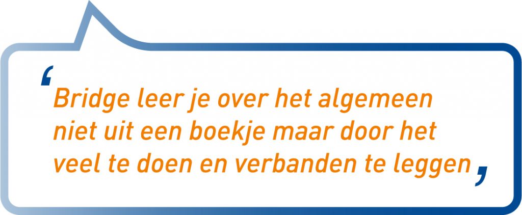 Bij bridge is elk spelletje een uitdaging. Nelly wil aan tafel graag winnen, maar ze wil ook het resultaat vergelijken met dat van anderen. Dan weet ze pas of ze het goed gedaan heeft. “Het gaat verder dan: ‘Oh, ik heb gewonnen.’ Want stel je voor dat je aan het eind van de avond de enige bent die dat betreffende spelletje heeft gewonnen. Dan wordt het bijzonder. Je weet sommige dingen pas achteraf en die onbekende factor maakt bridge extra leuk.” Nelly roept ook altijd naar haar cursisten dat het elke keer een nieuwe uitdaging is. “Elke keer weer een nieuw puzzeltje oplossen. Geen spel is hetzelfde, dus je móét blijven denken en die hersens blijven kraken. Dat maakt het spel zo mooi.”