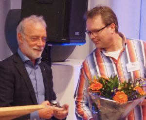 In eerste instantie ontwikkelde hij het voor de club B.C. de Hulksbrug, waarop hij zelf speelt. Dit rankingsysteem is sinds het najaar van 2016 beschikbaar gesteld door de NBB voor alle bridgeclubs in Nederland, onder de naam NBB-Clubranking. Hans Hoek (op de foto links), voorzitter van het district Drenthe, reikte de trofee uit. Foto Paul te Stroete